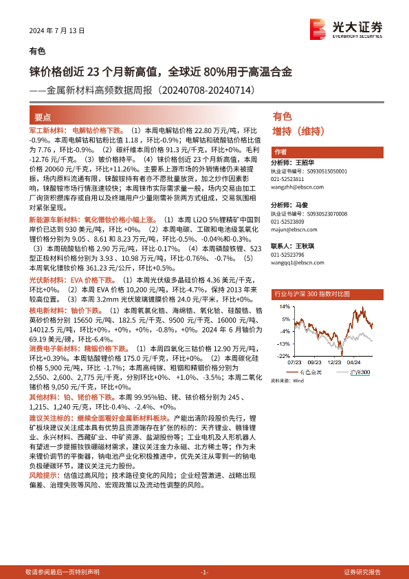 【光大证券】【20240713】20240713-光大证券-有色金属行业新材料高频数据周报:铼价格创近23个月新高值,全球近80%用于高温合金-22页
