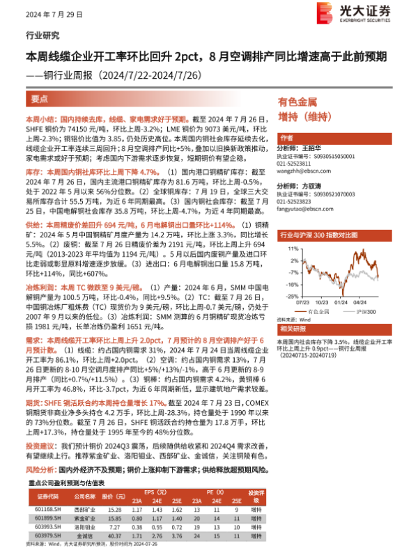 【光大证券】【20240729】20240729-光大证券-铜行业周报:本周线缆企业开工率环比回升2pct,8月空调排产同比增速高于此前预期-17页