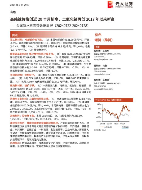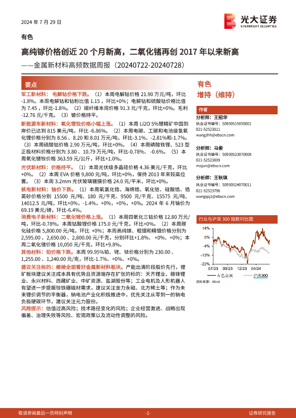 【光大证券】【20240729】金属新材料高频数据周报:高纯镓价格创近20个月新高,二氧化锗再创2017年以来新高-22页