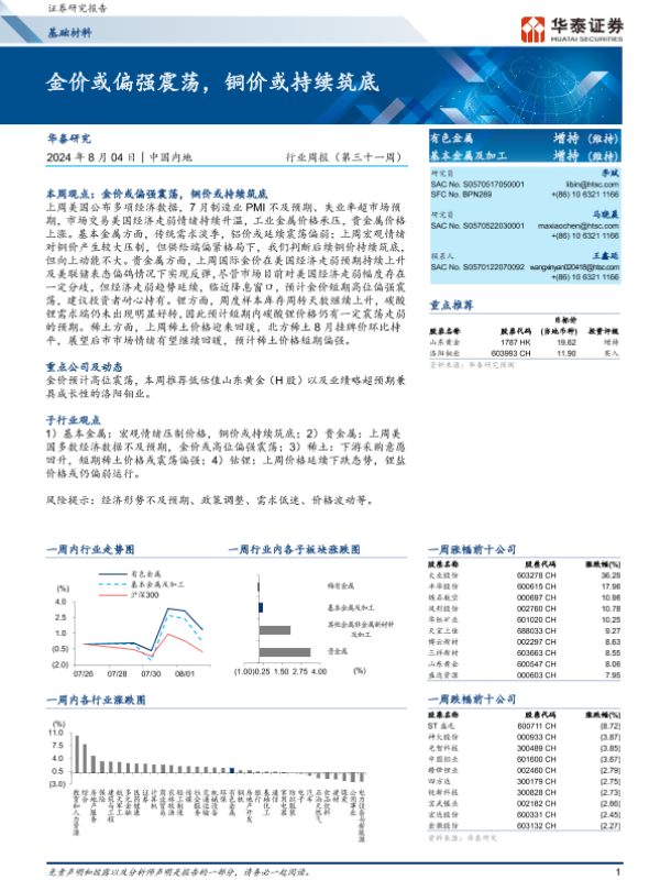 【华泰证券】【20240804】20240804-华泰证券-基础材料行业周报(第三十一周):金价或偏强震荡,铜价或持续筑底-16页