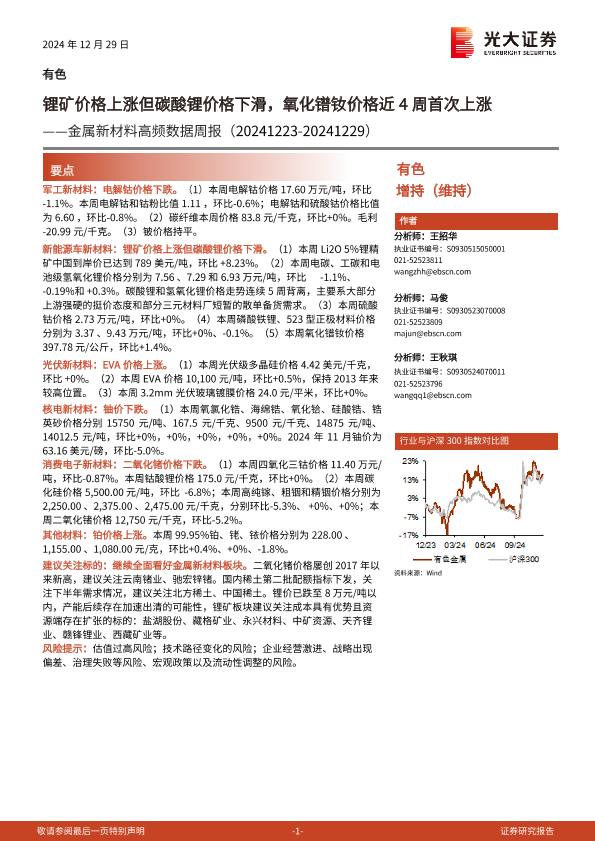 【光大证券】【20241229】20241229-光大证券-有色金属行业金属新材料高频数据周报:锂矿价格上涨但碳酸锂价格下滑,氧化镨钕价格近4周首次上涨-24页