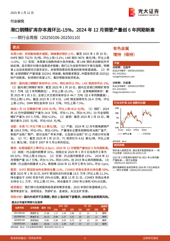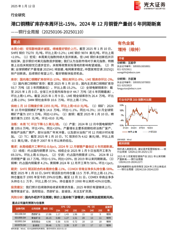 【光大证券】【20250112】光大证券-铜行业周报:港口铜精矿库存本周环比-15%,2024年12月铜管产量创6年同期新高-18页