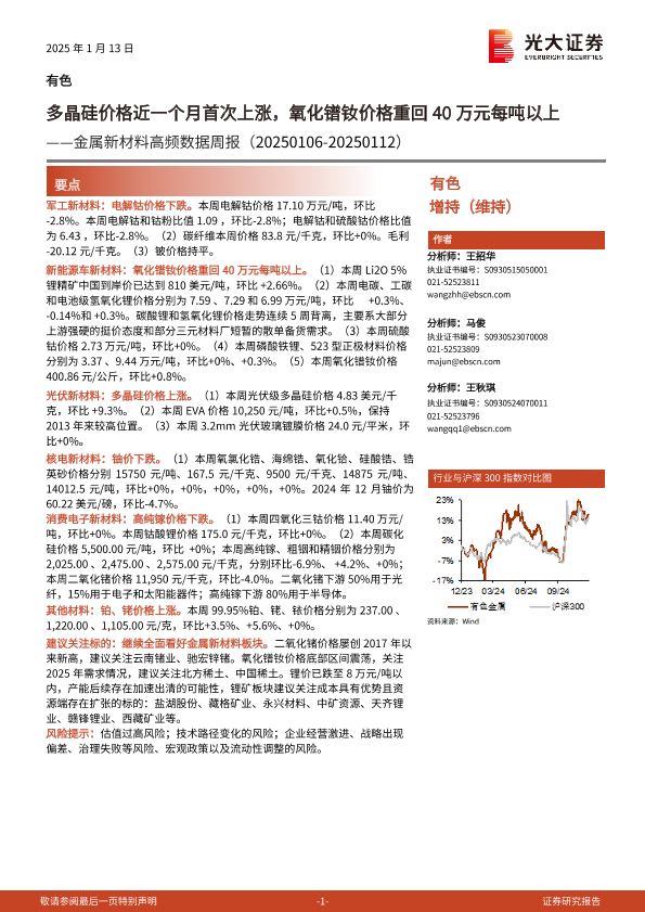 【光大证券】【20250113】金属新材料行业高频数据周报:多晶硅价格近一个月首次上涨,氧化镨钕价格重回40万元每吨以上-24页