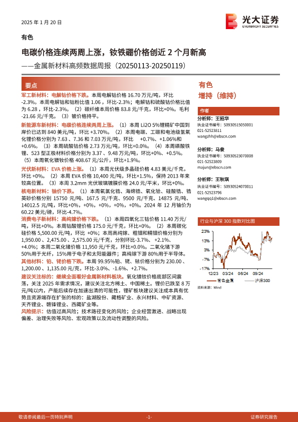 【光大证券】【20250120】有色金属行业金属新材料高频数据周报:电碳价格连续两周上涨,钕铁硼价格创近2个月新高-24页