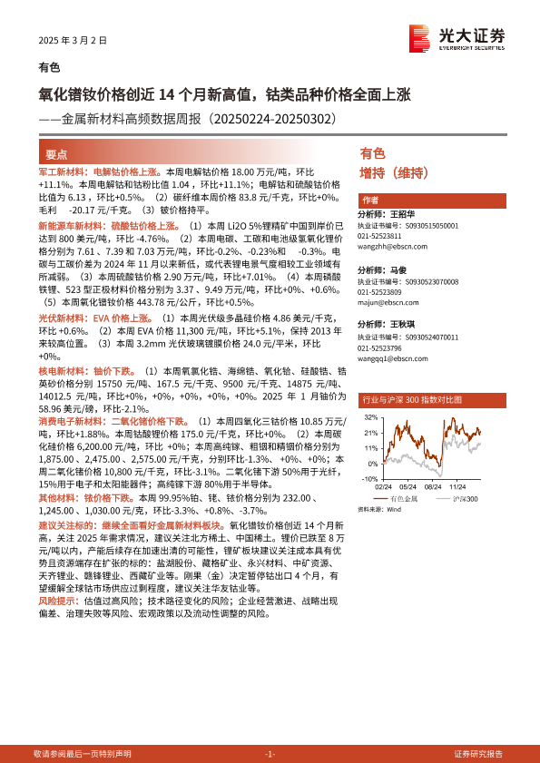 【光大证券】【20250302】有色行业金属新材料高频数据周报:氧化镨钕价格创近14个月新高值,钴类品种价格全面上涨-24页