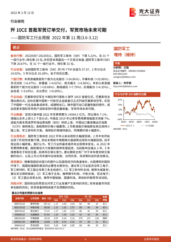 【光大证券】【20220313】国防军工行业周报2022年第11周:歼10CE首批军贸订单交付,军贸市场未来可期-9页