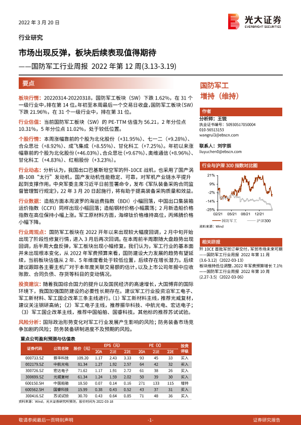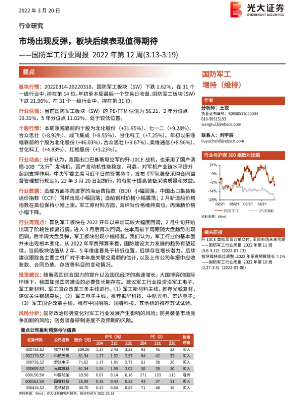 【光大证券】【20220320】国防军工行业周报2022年第12周:市场出现反弹,板块后续表现值得期待-10页