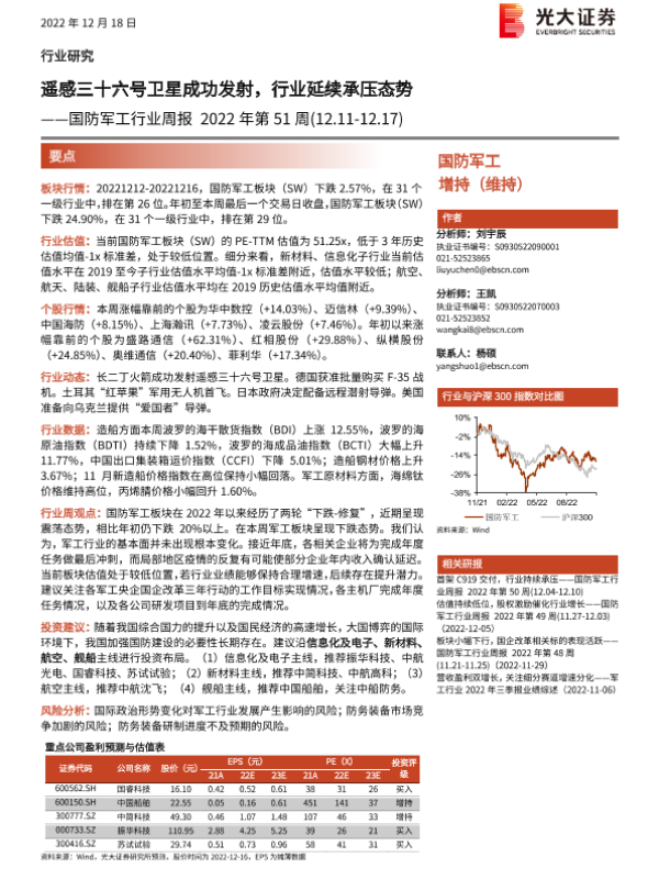 【光大证券】【20221218】国防军工行业周报2022年第51周:遥感三十六号卫星成功发射,行业延续承压态势-14页
