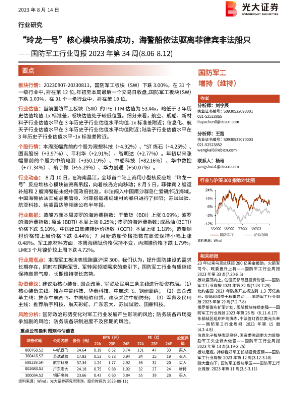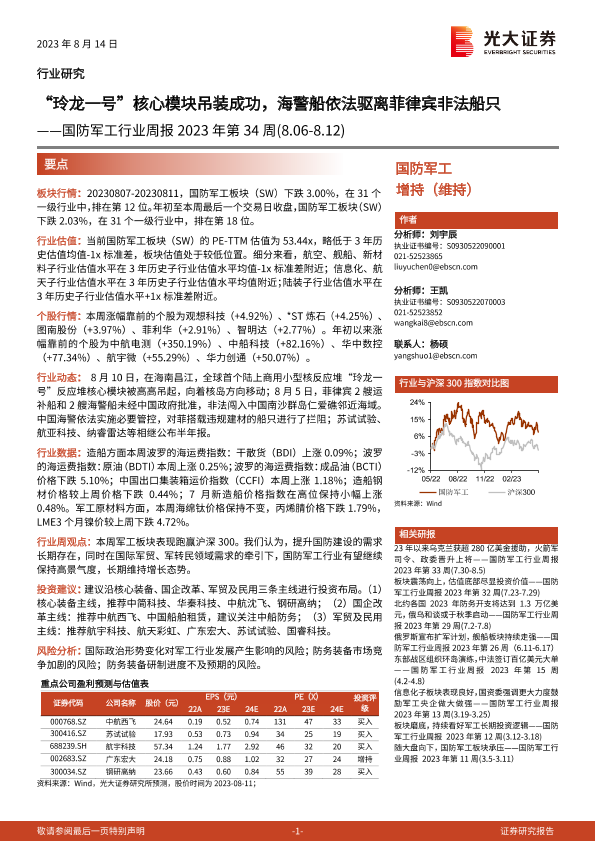【光大证券】【20230814】国防军工行业周报2023年第34周:“玲龙一号”核心模块吊装成功,海警船依法驱离菲律宾非法船只-21页