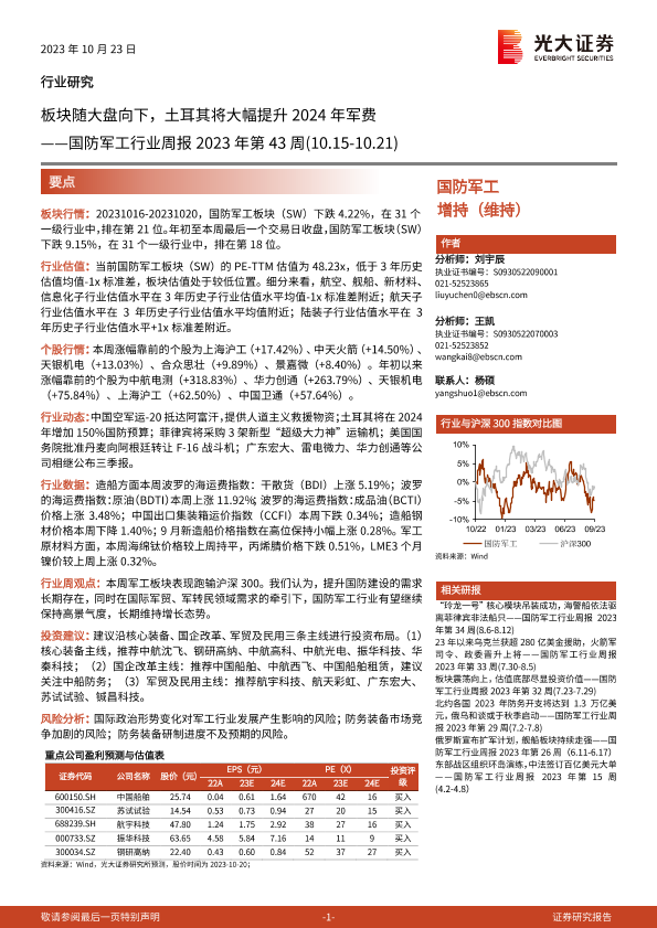 【光大证券】【20231023】国防军工行业周报2023年第43周:板块随大盘向下,土耳其将大幅提升2024年军费-17页