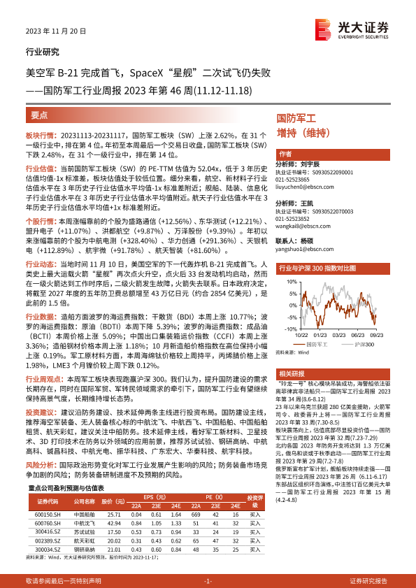 【光大证券】【20231120】国防军工行业周报2023年第46周:美空军B-21完成首飞,SpaceX“星舰”二次试飞仍失败-16页