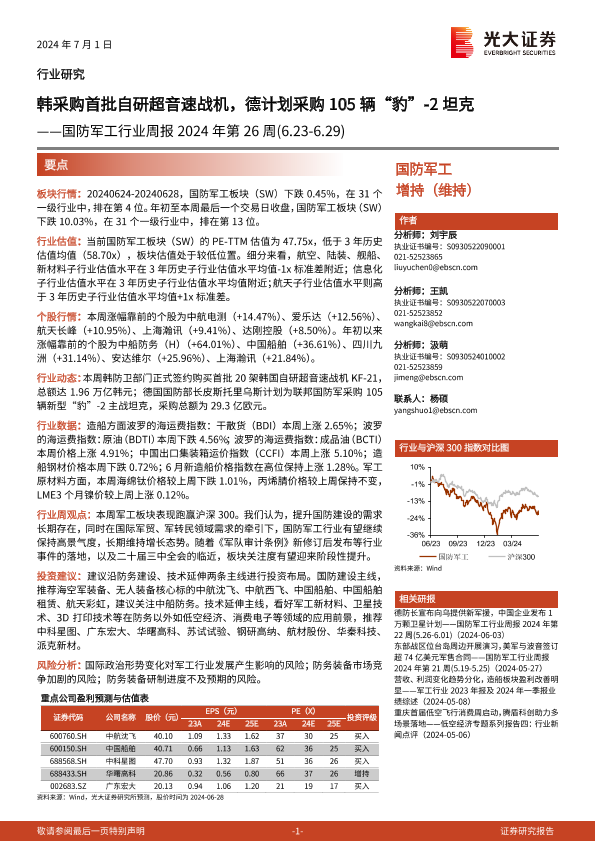 【光大证券】【20240701】国防军工行业周报2024年第26周:韩采购首批自研超音速战机,德计划采购105辆“豹”-2坦克-15页