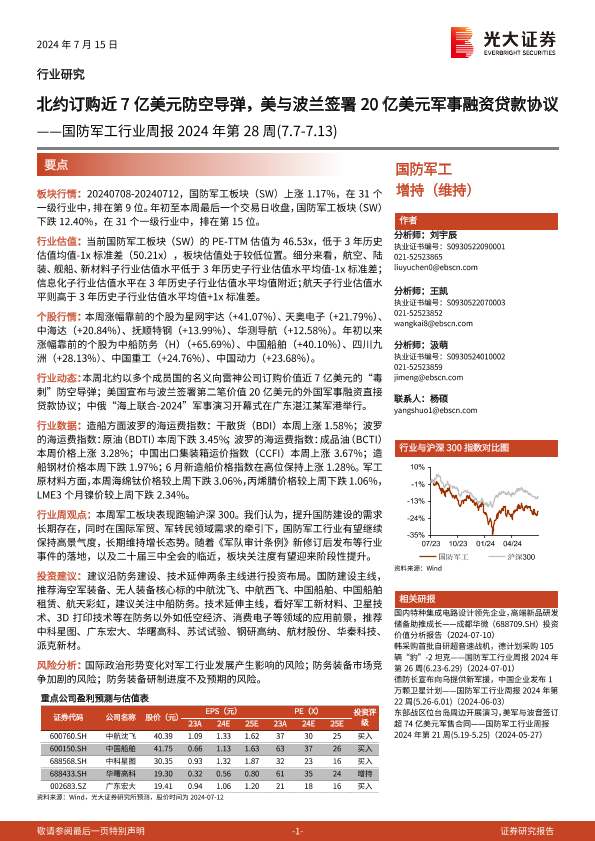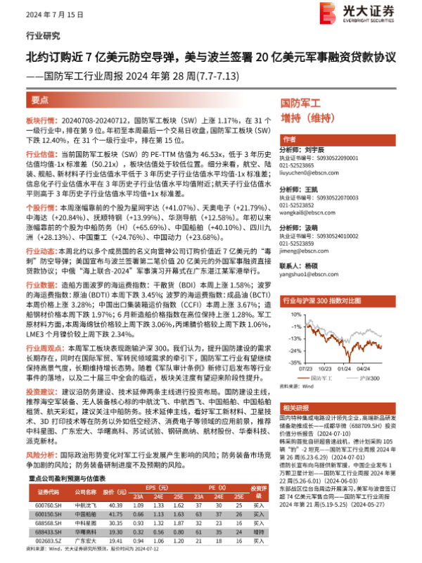 【光大证券】【20240715】2024年第28周国防军工行业周报:北约订购近7亿美元防空导弹,美与波兰签署20亿美元军事融资贷款协议-18页
