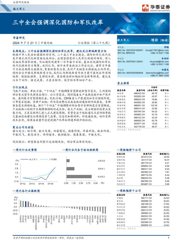 【华泰证券】【20240721】20240721-华泰证券-航天军工行业周报(第二十九周):三中全会强调深化国防和军队改革-17页