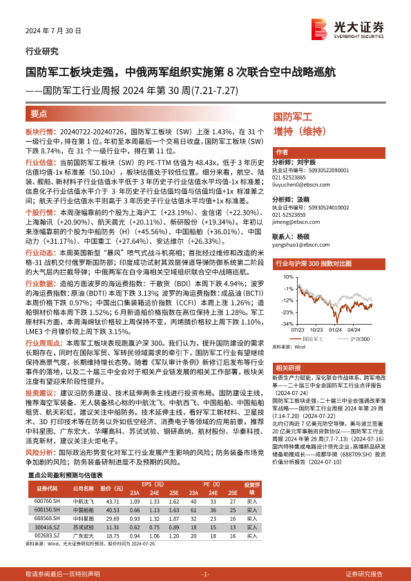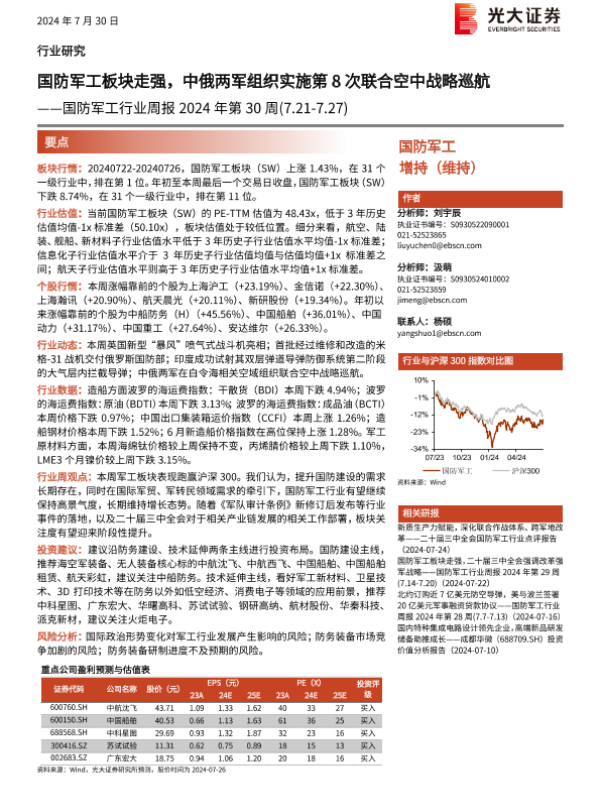 【光大证券】【20240730】国防军工行业周报2024年第30周:国防军工板块走强,中俄两军组织实施第8次联合空中战略巡航-16页
