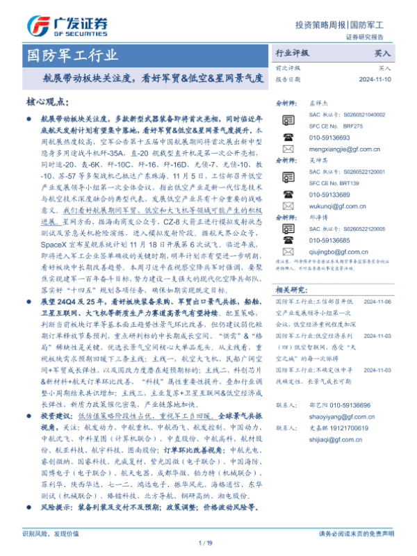 【广发证券】【20241110】20241110-广发证券-国防军工行业投资策略周报:航展带动板块关注度,看好军贸&低空&星网景气度-19页