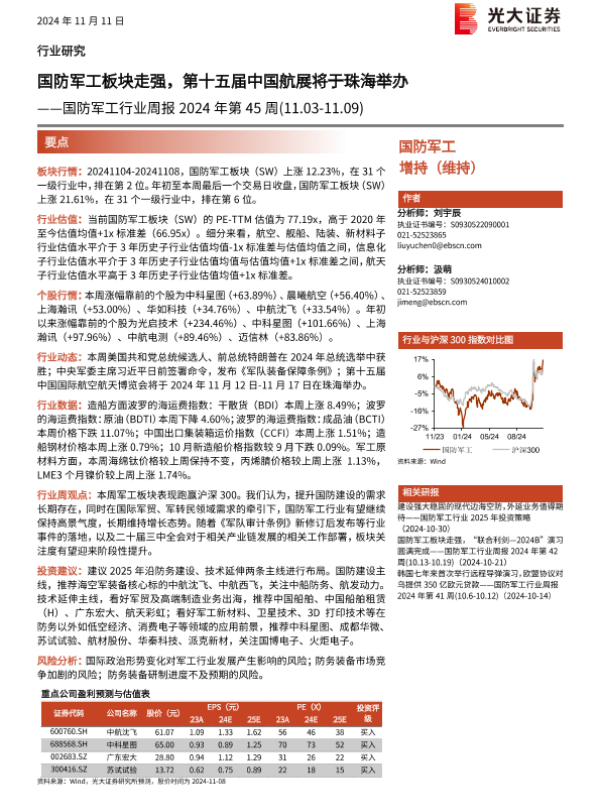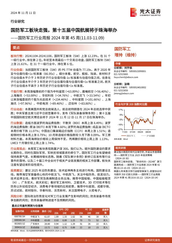 【光大证券】【20241111】国防军工行业周报2024年第45周:国防军工板块走强,第十五届中国航展将于珠海举办-15页
