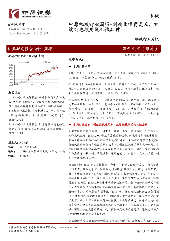 【中原证券】【20210308】机械行业周报:制造业投资复苏,继续拥抱顺周期机械品种-16页