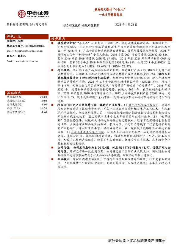 【中泰证券】【20230128】东和新材839792.NQ北交所新股简报:镁质耐火新材“小巨人”-18页