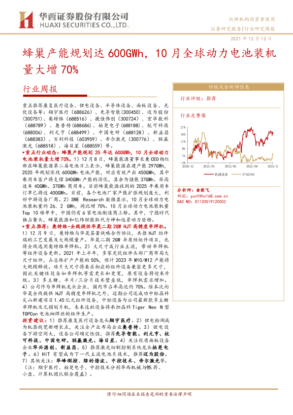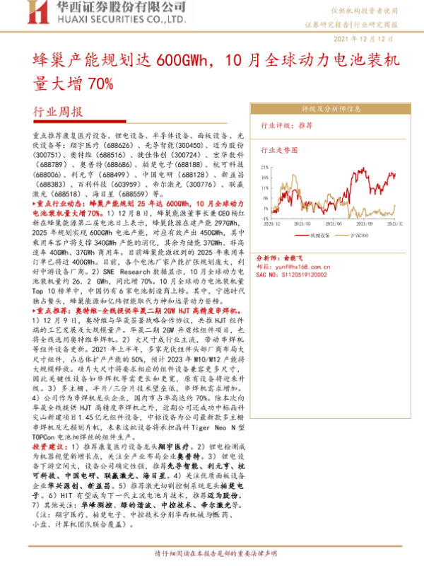 【华西证券】【20211212】20211212-华西证券-机械设备行业周报:蜂巢产能规划达600GWh,10月全球动力电池装机量大增70%-21页
