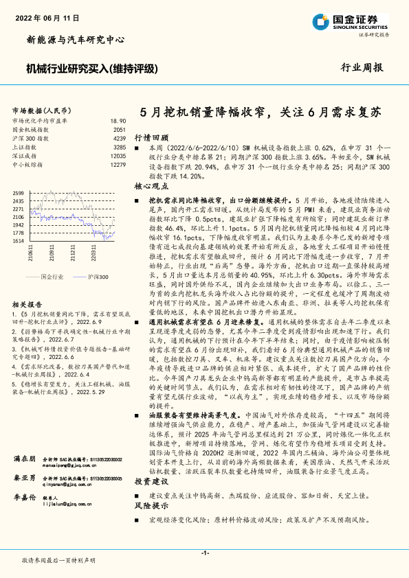 【国金证券】【20220611】20220611-国金证券-机械行业研究周报:5月挖机销量降幅收窄,关注6月需求复苏-19页