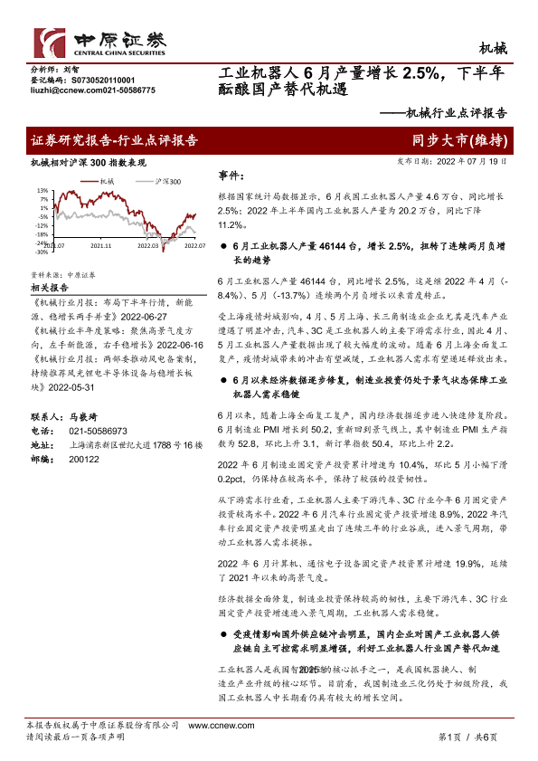 【中原证券】【20220719】机械行业点评报告:工业机器人6月产量增长2.5%,下半年酝酿国产替代机遇-6页