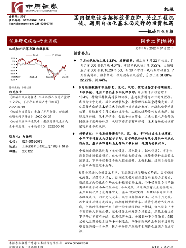 【中原证券】【20220725】20220725-中原证券-机械行业月报:国内锂电设备招标放量在即,关注工程机械、通用自动化基本面反弹的投资机遇-23页