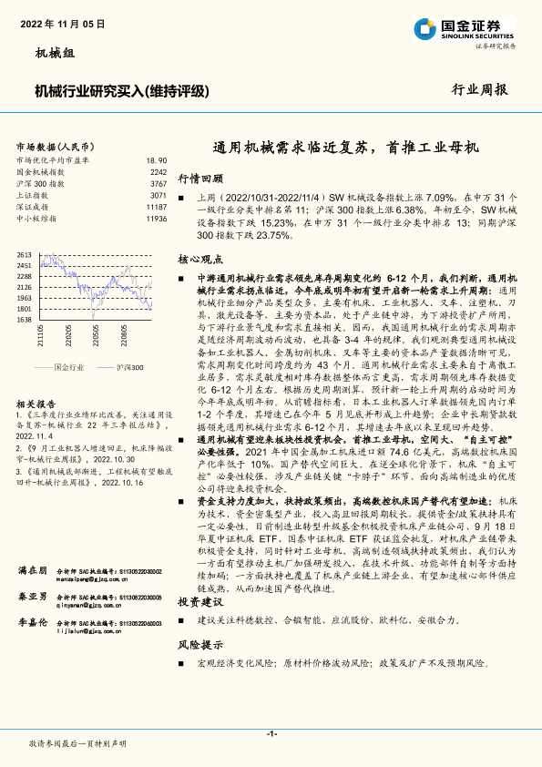 【国金证券】【20221105】20221105-国金证券-机械行业研究:通用机械需求临近复苏,首推工业母机-17页