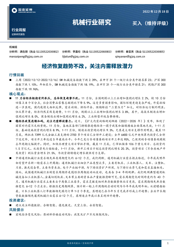 【国金证券】【20221218】20221218-国金证券-机械行业研究:经济恢复趋势不改,关注内需释放潜力-16页