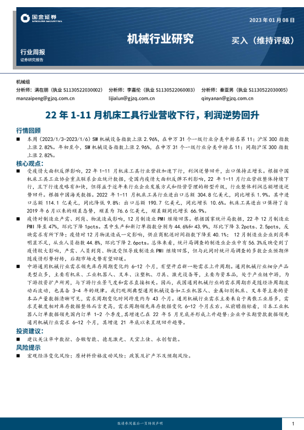 【国金证券】【20230108】20230108-国金证券-机械行业研究:22年1-11月机床工具行业营收下行,利润逆势回升-17页