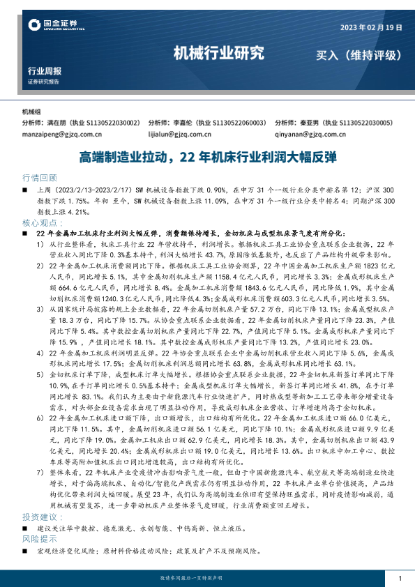 【国金证券】【20230219】20230219-国金证券-机械行业研究:高端制造业拉动,22年机床行业利润大幅反弹-15页