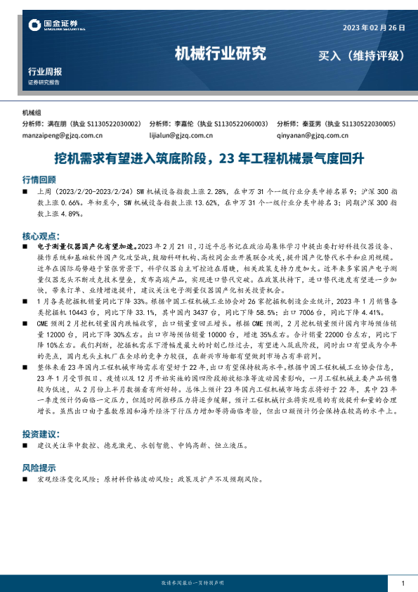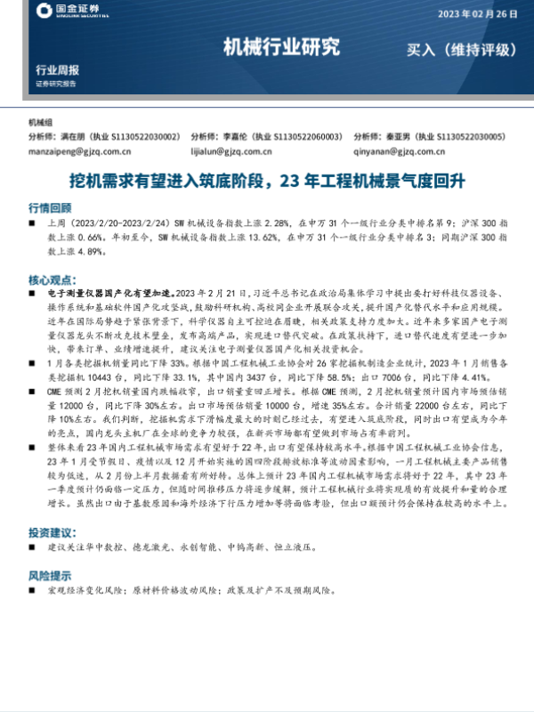 【国金证券】【20230226】20230226-国金证券-机械行业研究:挖机需求有望进入筑底阶段,23年工程机械景气度回升-15页
