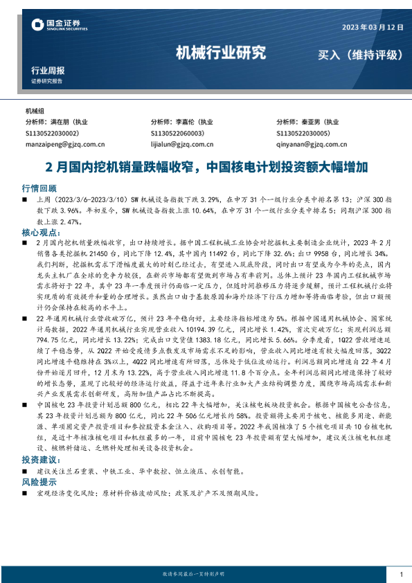 【国金证券】【20230312】20230312-国金证券-机械行业研究:2月国内挖机销量跌幅收窄,中国核电计划投资额大幅增加-16页