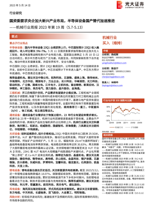 【光大证券】【20230514】机械行业周报2023年第19周:国资委要求央企加大新兴产业布局,半导体设备国产替代加速推进-21页