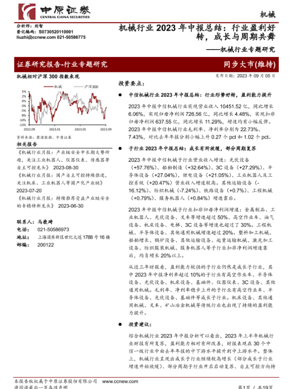 【中原证券】【20230905】机械行业2023年中报总结:行业盈利好转,成长与周期共舞-19页