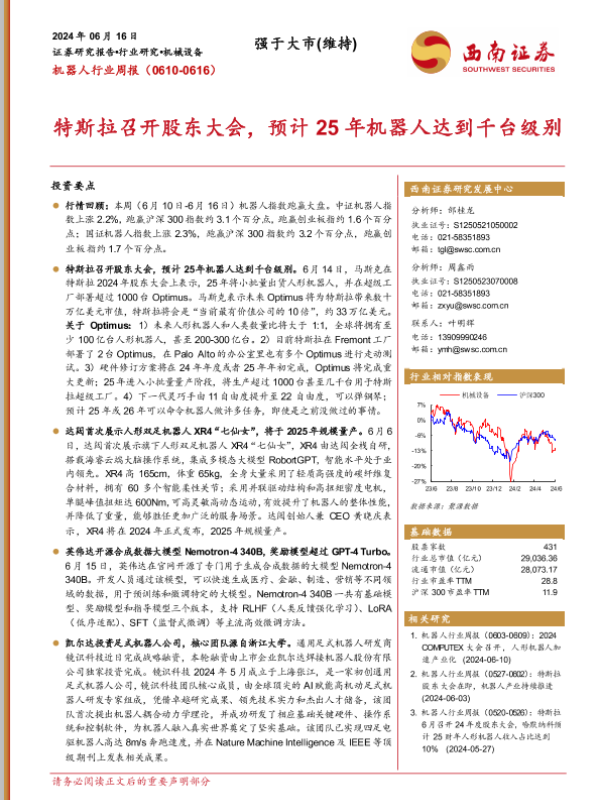 【西南证券】【20240616】机器人行业周报:特斯拉召开股东大会,预计25年机器人达到千台级别-13页
