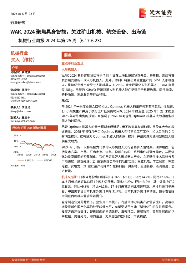 【光大证券】【20240623】2024年第25周机械行业周报:WAIC 2024聚焦具身智能,关注矿山机械、轨交设备、出海链-11页