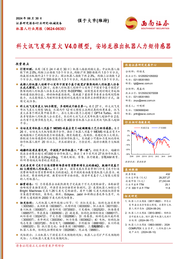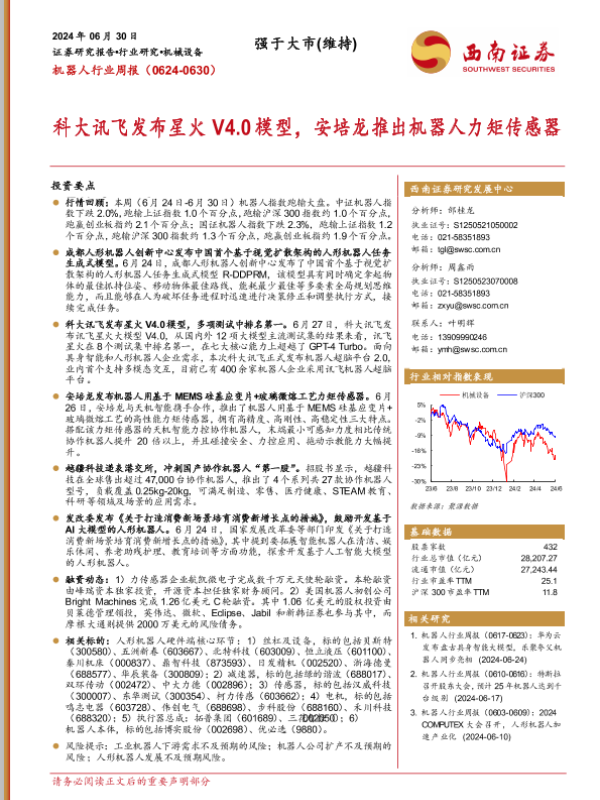 【西南证券】【20240630】机器人行业周报:科大讯飞发布星火V4.0模型,安培龙推出机器人力矩传感器-11页
