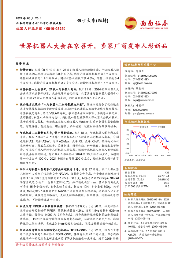 【西南证券】【20240825】20240825-西南证券-机器人行业周报:世界机器人大会在京召开,多家厂商发布人形新品-14页