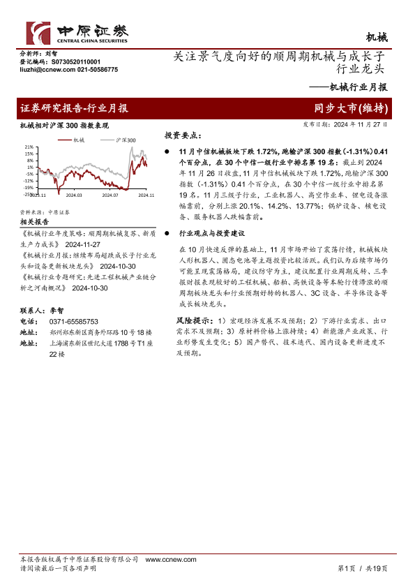 【中原证券】【20241127】20241127-中原证券-机械行业月报:关注景气度向好的顺周期机械与成长子行业龙头-19页
