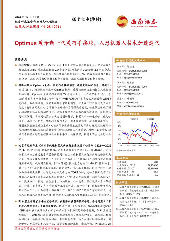 【西南证券】【20241201】机器人行业周报:Optimus展示新一代灵巧手接球,人形机器人技术加速迭代-12页