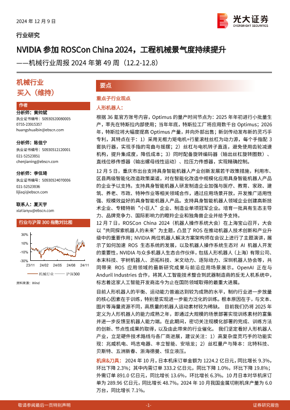 【光大证券】【20241209】2024年第49周机械行业周报:NVIDIA参加ROSCon China 2024,工程机械景气度持续提升-12页