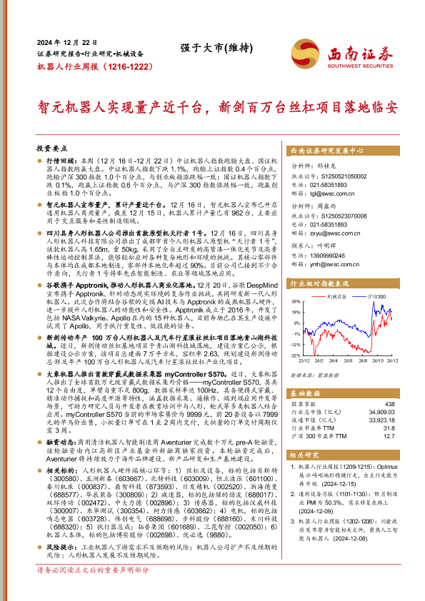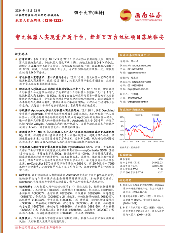 【西南证券】【20241222】20241222-西南证券-机器人行业周报:智元机器人实现量产近千台,新剑百万台丝杠项目落地临安-11页