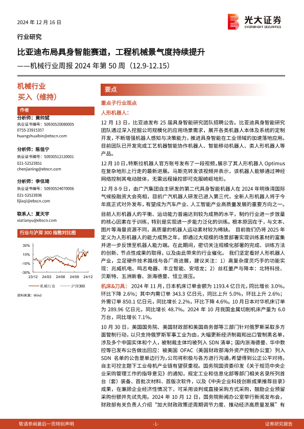 【光大证券】【20241216】2024年第50周机械行业周报:比亚迪布局具身智能赛道,工程机械景气度持续提升-12页