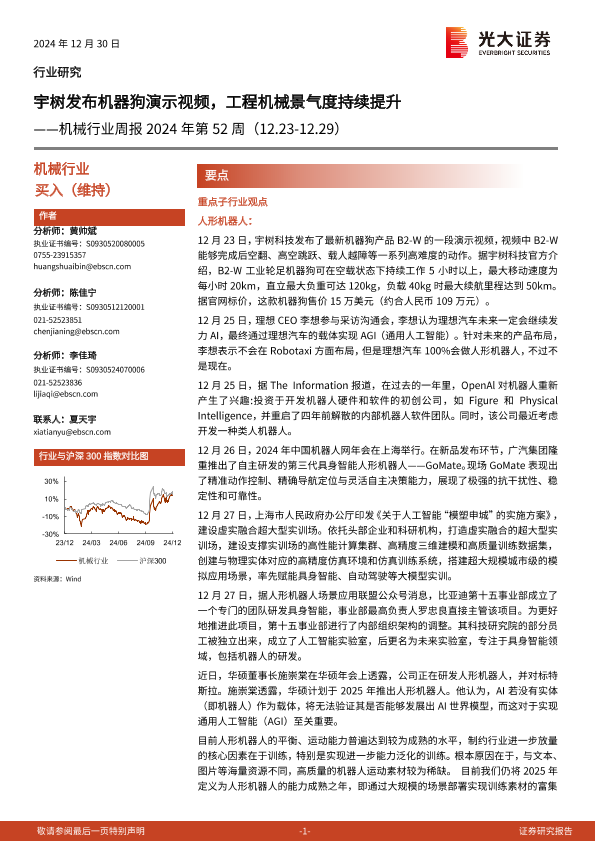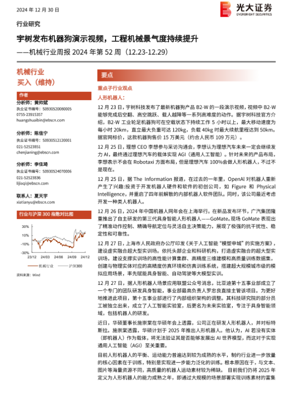 【光大证券】【20241230】机械行业周报2024年第52周:宇树发布机器狗演示视频,工程机械景气度持续提升-13页