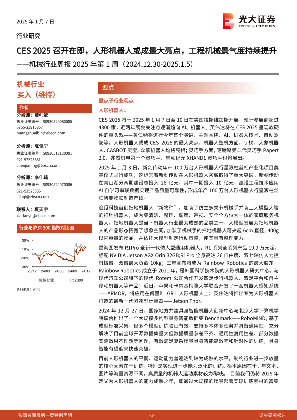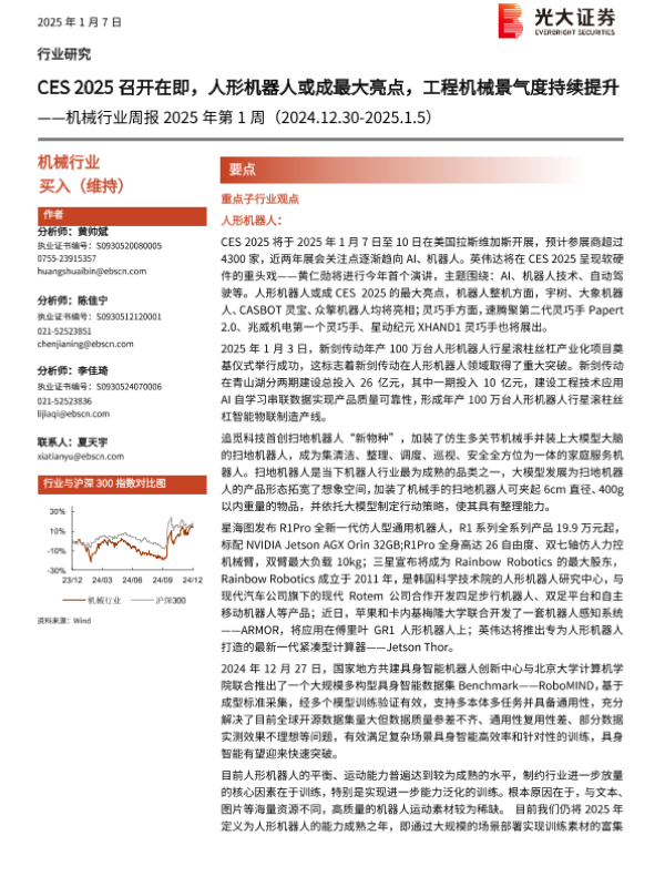 【光大证券】【20250107】机械行业周报2025年第1周:CES 2025召开在即,人形机器人或成最大亮点,工程机械景气度持续提升-13页