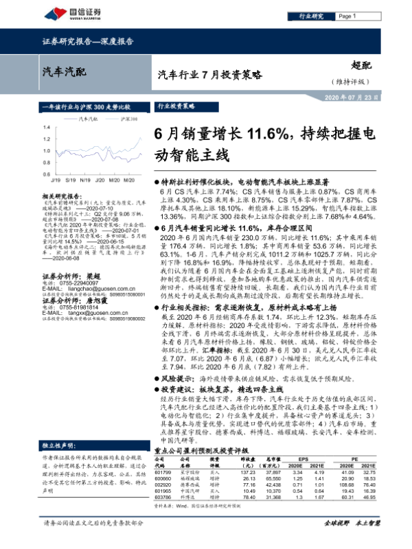 【国信证券】【20200723】汽车行业7月投资策略:6月销量增长11.6%,持续把握电动智能主线-31页