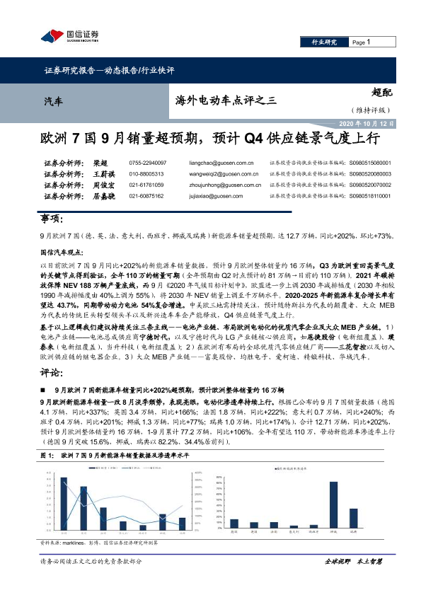 【国信证券】【20201012】海外电动车点评之三:欧洲7国9月销量超预期,预计Q4供应链景气度上行-9页
