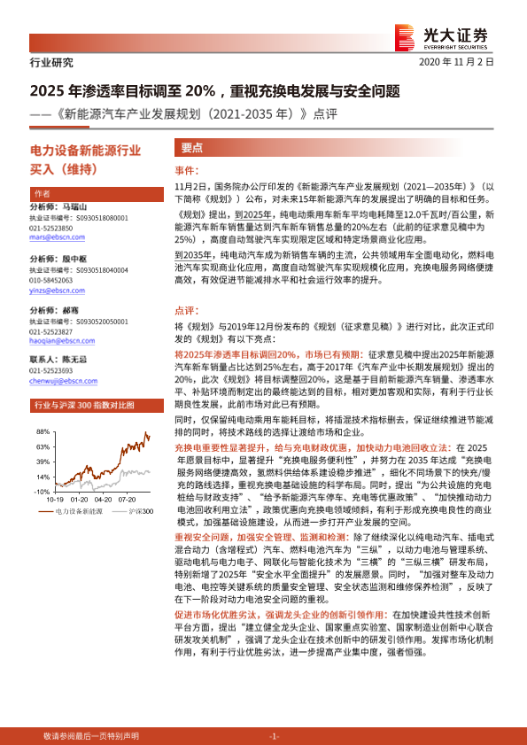 【光大证券】【20201102】《新能源汽车产业发展规划(2021-2035年)》点评:2025年渗透率目标调至20%,重视充换电发展与安全问题-4页