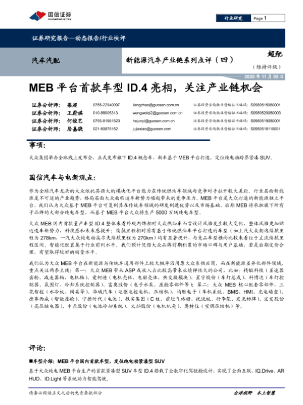 【国信证券】【20201105】20201105-国信证券-新能源汽车产业链系列点评(四):MEB平台首款车型ID.4亮相,关注产业链机会-8页